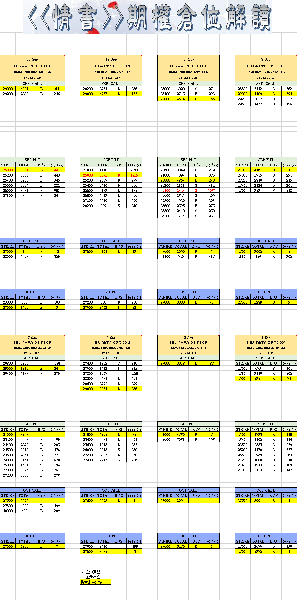 留意上日期指持續減倉明顯又有人食糊,再加上即月PUT OPTION 大增,若指數下破重大支持位27600對九月中下旬市況未必有利,一眾好友們萬萬小心。