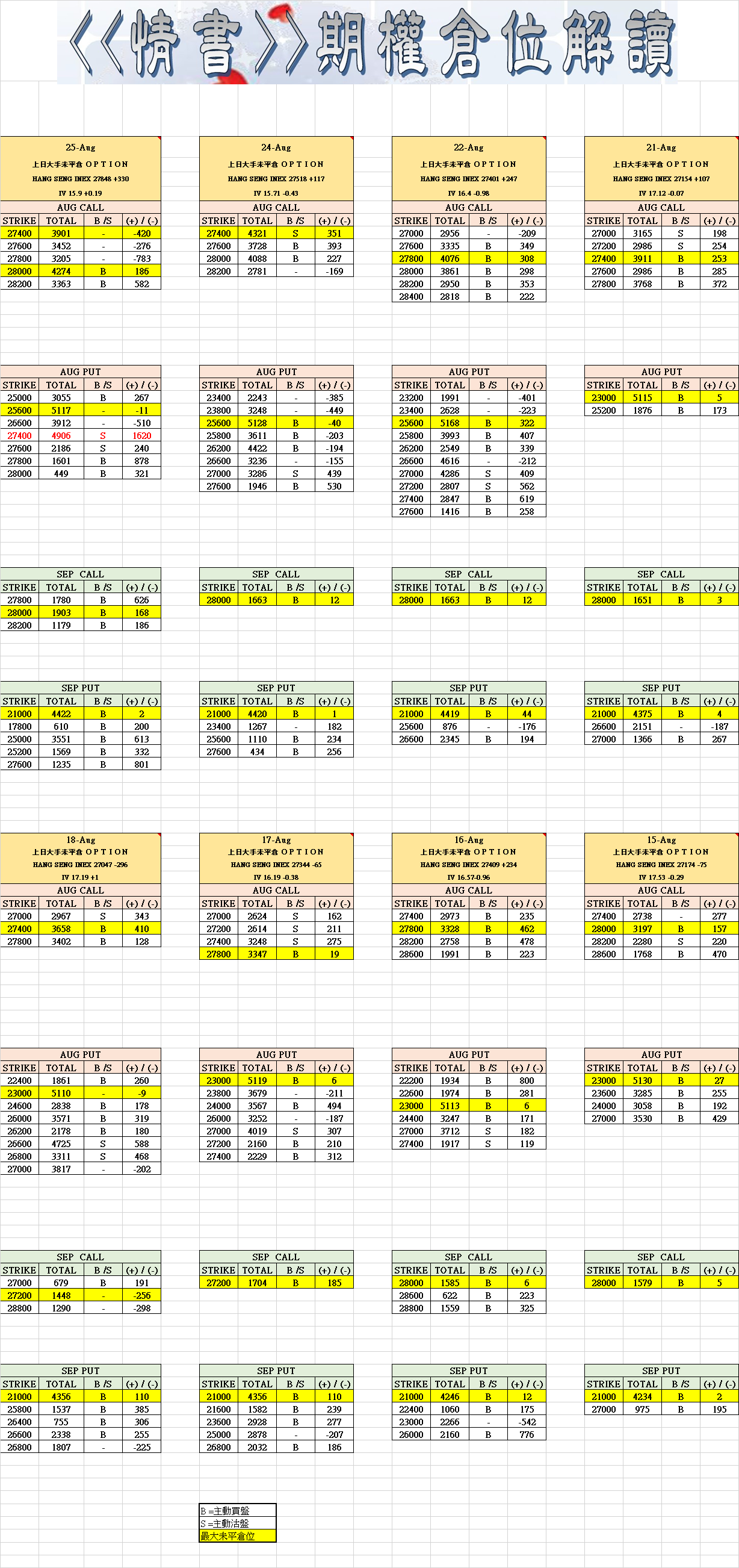 8月期指未平倉合約減少41,867張至37,465張;9月期指未平倉合約增加35,221張至149,134張。